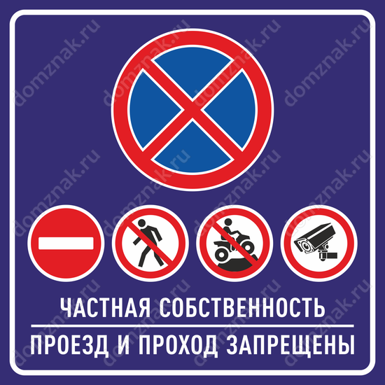 Вы можете заказать Табличку «Частная собственность проезд и проход запрещены!» по индивидуальному дизайну или воспользоваться готовым вариантом от нашей компании.