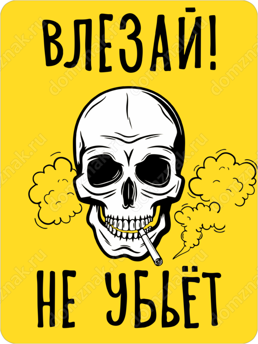Табличка «Влезай! не убьёт!» изготовлена из пластика ПВХ, толщиной 4 мм. Изображение наносится по технологии УФ-печати. Табличка предназначена для использования как в помещении, так и на улице.